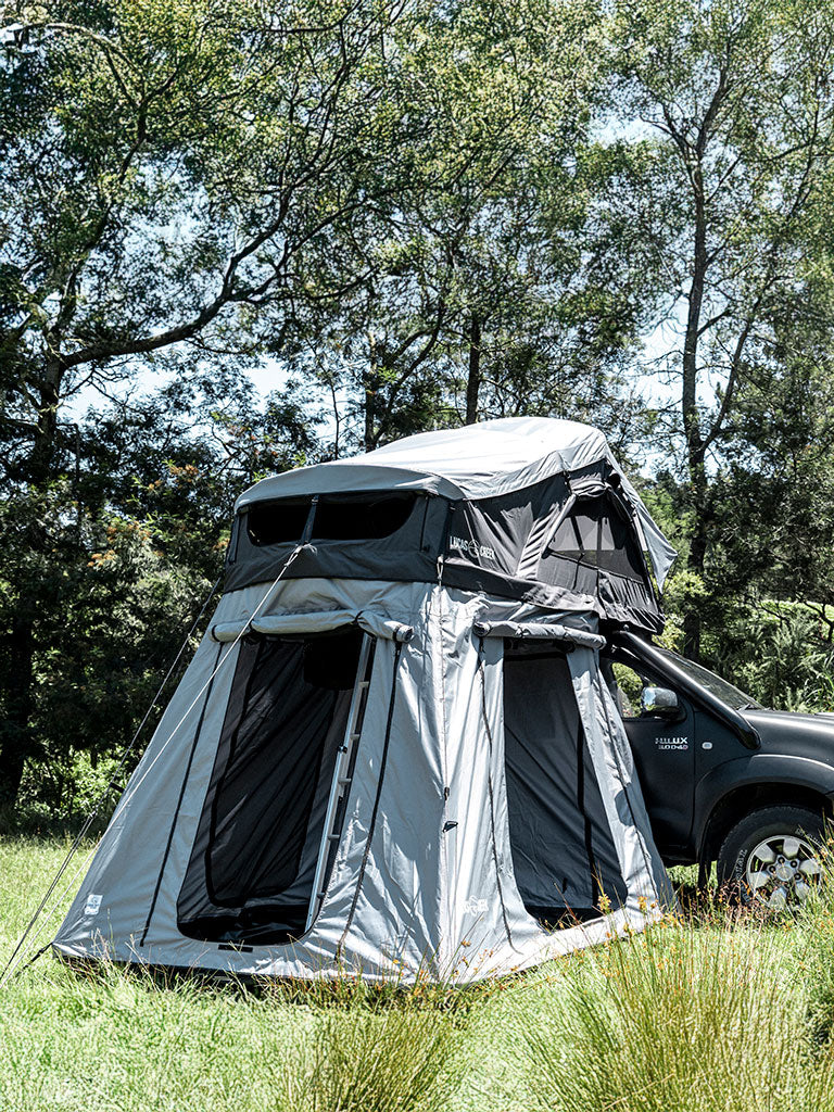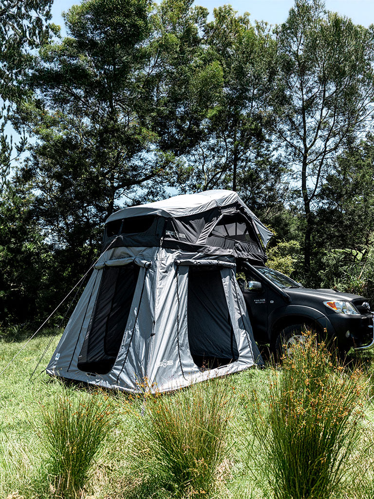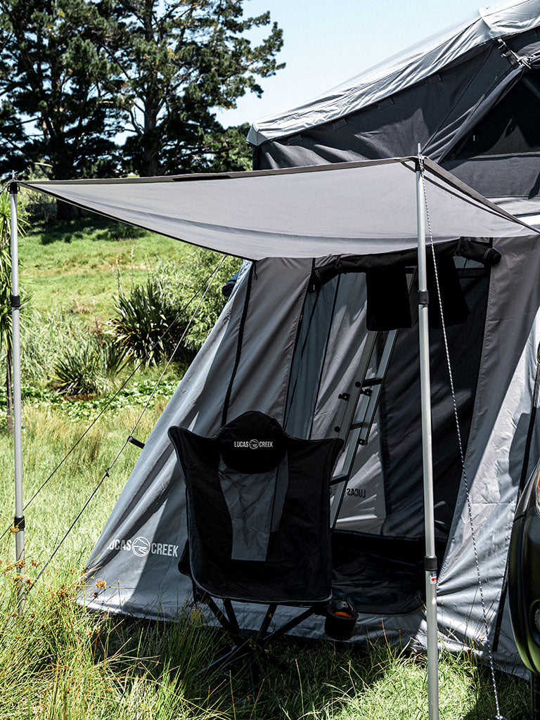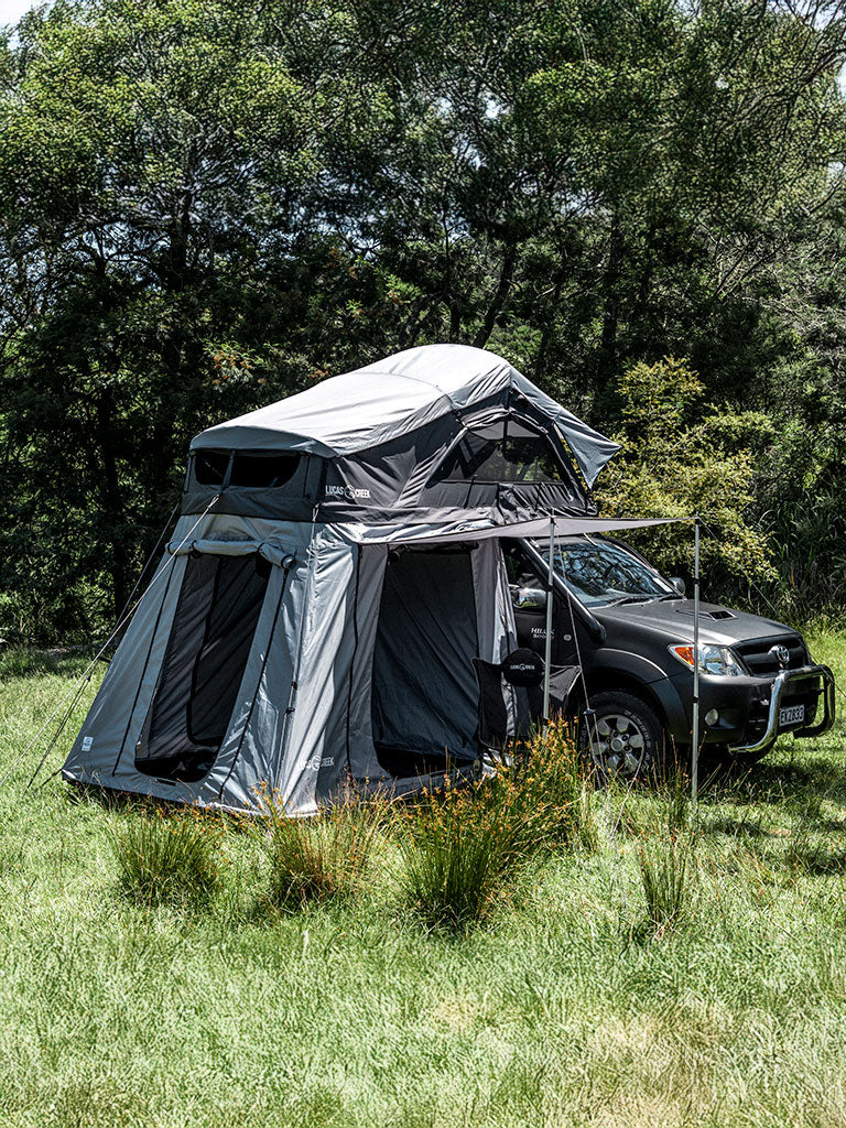 A fully waterproof and adjustable annex room to suit Gen 3 and Gen 4 Lucas Creek rooftop tents. Adds a spacious sheltered area with insect mesh, a deep bucket floor, and internal height adjustment straps. Available in 3 sizes. Now includes poles to create and awning from the side or front door flaps.